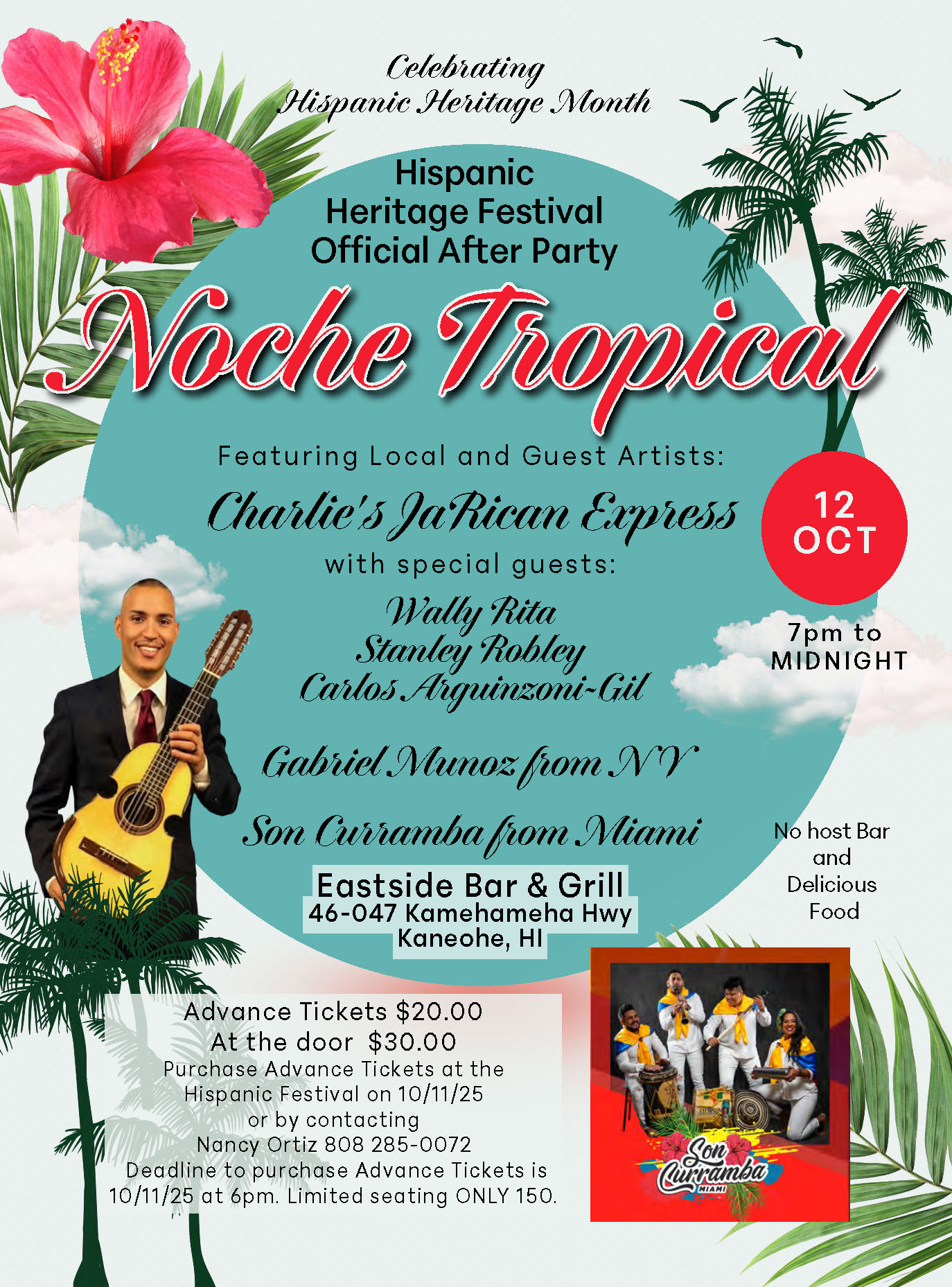 Continue the fun with Noche Tropical at Eastside Bar and Grill featuring Charlie’s JaRican Express plus special guests artist from the festival. Purchase advance tickets at the Alma Latina booth next to the stage.